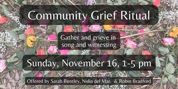 This Community Grief Ritual offers a safe ceremonial space to bring your grief. We believe grief is a sacred aspect of our aliveness and is something to be honored and valued. Yet, most of us live in a culture that denies the impact of life’s many losses. Most of us lack rituals and community with which to experience the transformative potential of grief. This ritual is for you if you are experiencing any form of grief, from personal, to ancestral, to the sorrows of the world.